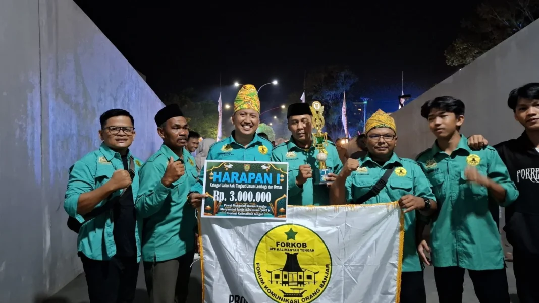 Palangka Raya | EnterKal – Forum Komunikasi Orang Banjar (FORKOB) Kalimantan Tengah berhasil meraih Juara Harapan I dalam kategori Jalan Kaki Tingkat Umum Lembaga dan Ormas pada Pawai Akbar Muharram 1447 Hijriah. Kegiatan ini diselenggarakan oleh Pemerintah Provinsi Kalimantan Tengah dalam rangka menyambut Tahun Baru Islam 1 Muharram 1447 H.