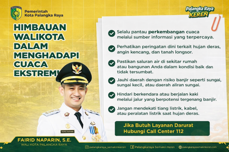 Sebagai bentuk kesiapsiagaan layanan publik, Pemerintah Kota Palangka Raya menegaskan bahwa masyarakat dapat menghubungi Call Center 112 apabila membutuhkan layanan darurat akibat dampak cuaca ekstrem.