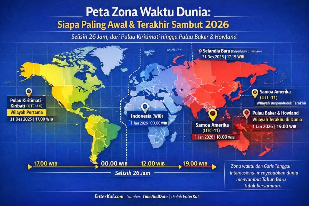 Jakarta | EnterKal — Pergantian Tahun Baru selalu menjadi momen global yang dinanti masyarakat dunia. Namun, perbedaan zona waktu membuat perayaan Tahun Baru 2026 tidak berlangsung serentak di setiap negara.